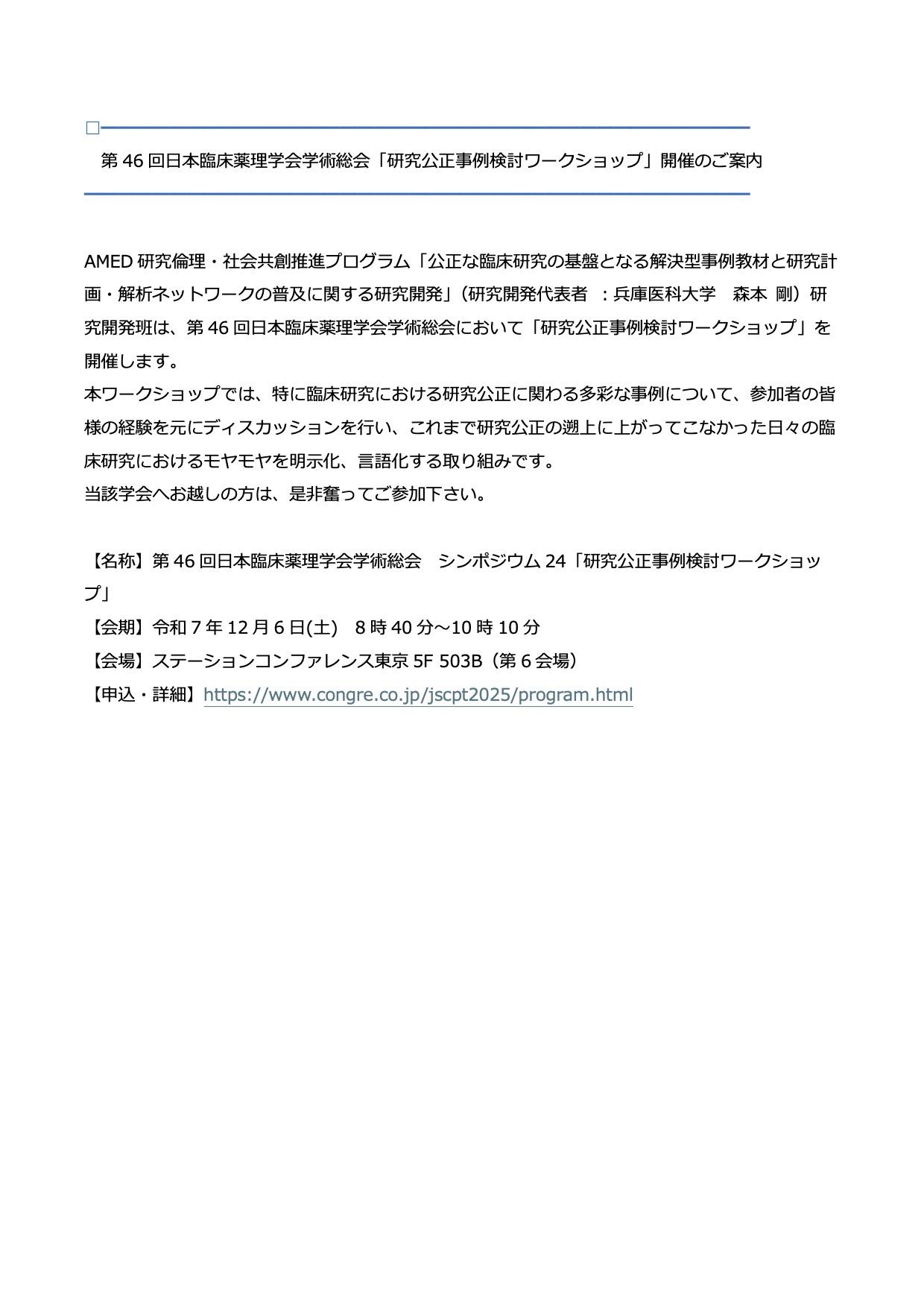 • 第46回日本臨床薬理学会学術総会 研究公正事例検討ワークショップ開催のご案内 2025年11月7日